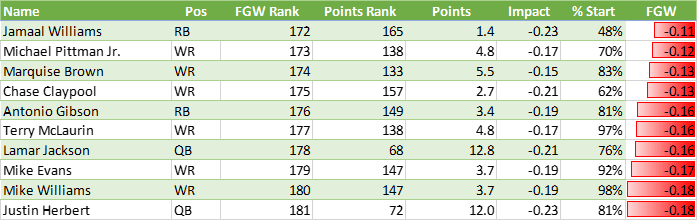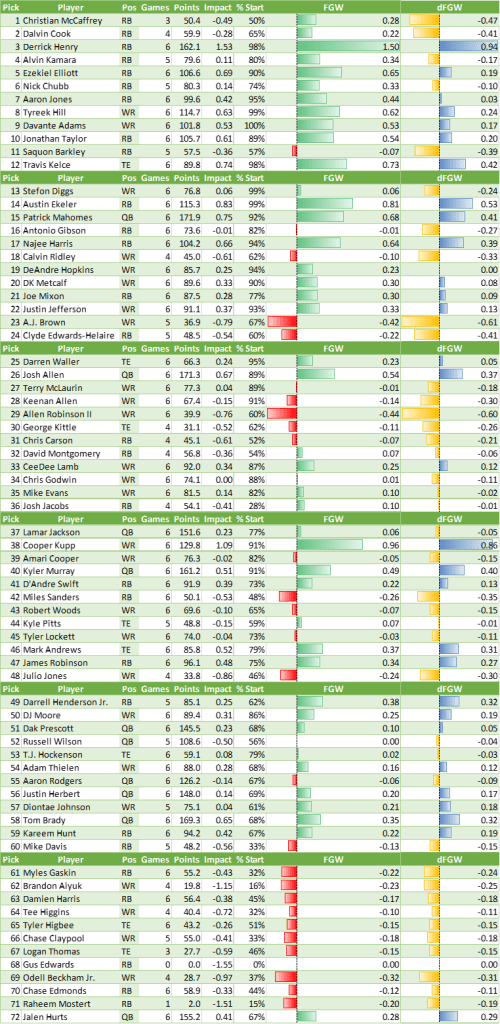 - I extended the Draft Recap list to round 6 for the breakdown, because I had to go pretty far to create the dFGW model. Here’s what you need to know from rounds 7-10: Ja’Marr, Deebo, and Mike Williams were good picks. Fournette was good, too. If you can get positive FGW this late, you’re doing great.