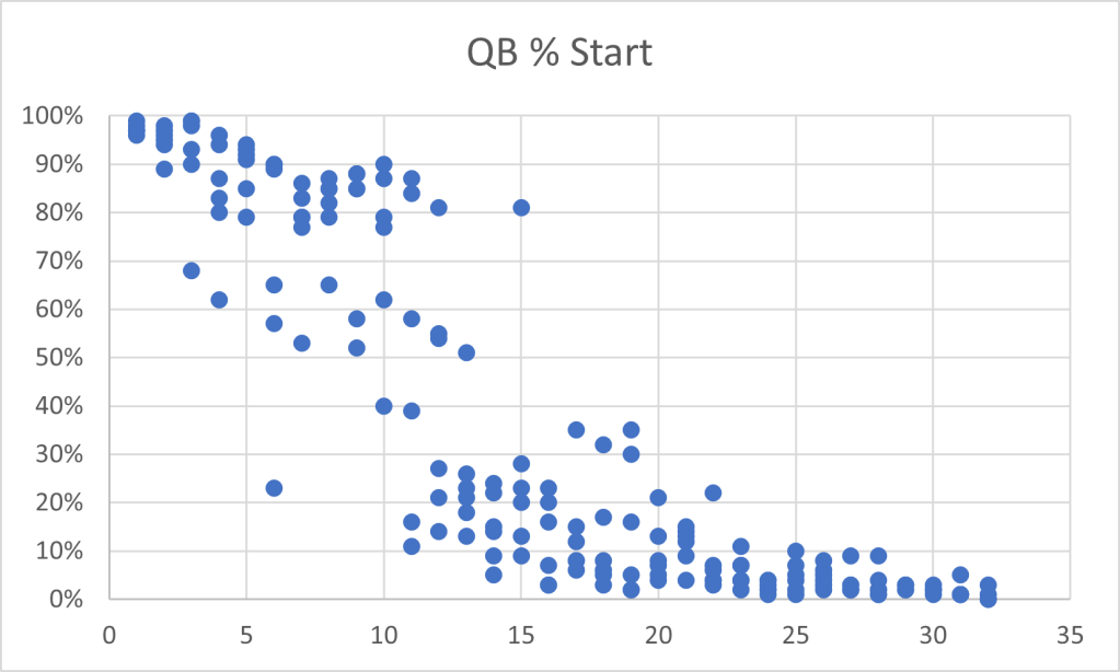 Unsurprisingly, the top 12 or so QBs have a pretty high % started rate, as most leagues have between 8-14 teams in them. Steep drop-off after that, then flatline.