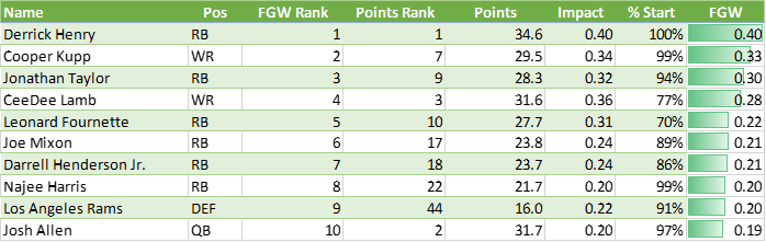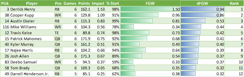 Hurts is actually #12 on the best picks list with dFGW of 0.29, just behind Mark Andrews at 0.31. The reason why I keyed on Hurts for the title is just how much he stands out in the draft roll-up. He is: - The only player in Round 6 with positive FGW