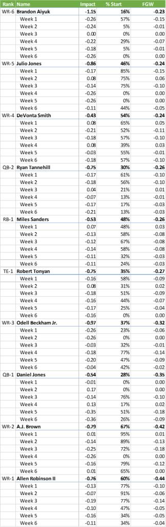 I mentioned back in Week 4 how I was frustrated with the % started numbers for obviously injured fantasy players – AJ Brown (18%), Julio Jones (13%), and Christian McCaffrey (12%) headlined that week. The fact is the typical fantasy football team owner that would use a metric like FGW is more likely to start a player in line with expert rankings, rather than the average Yahoo! user.