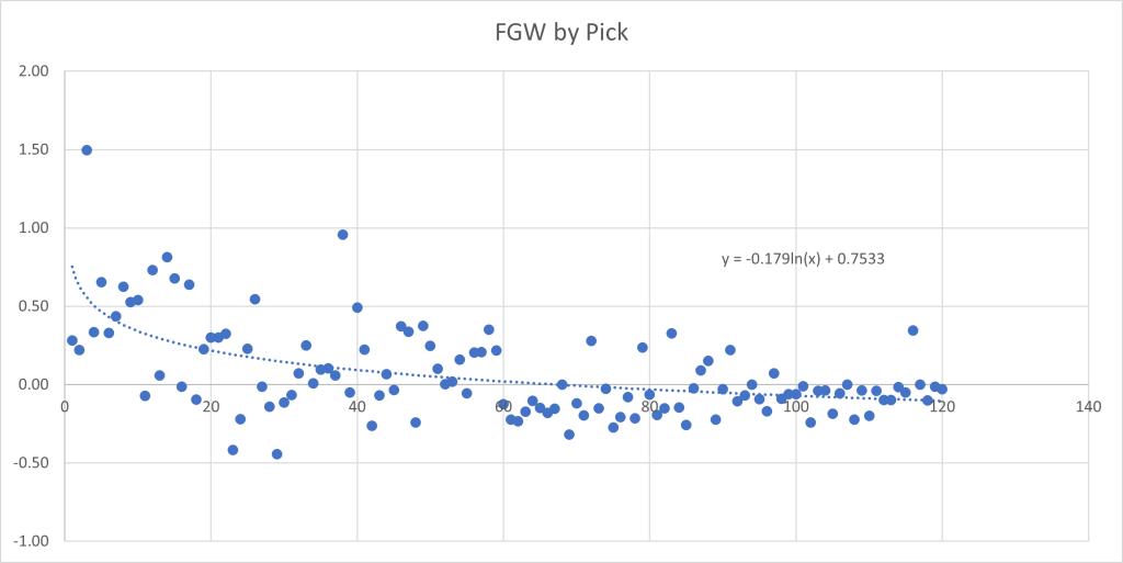 To get dFGW, I created a curve that approximates the FGW a player should have based on draft position, by taking a natural logarithmic trend against the current pick-by-pick breakdown: