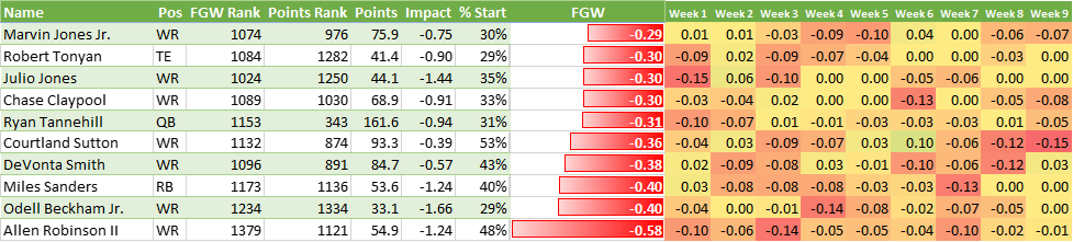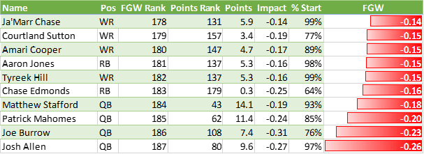 His actual FGW? -0.03. So on average, he’s decreased your chances of winning versus an average starter, after considering the fact that you probably didn’t start him weeks 1 and 2.