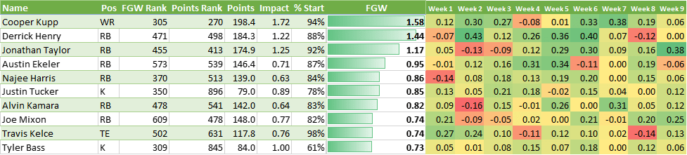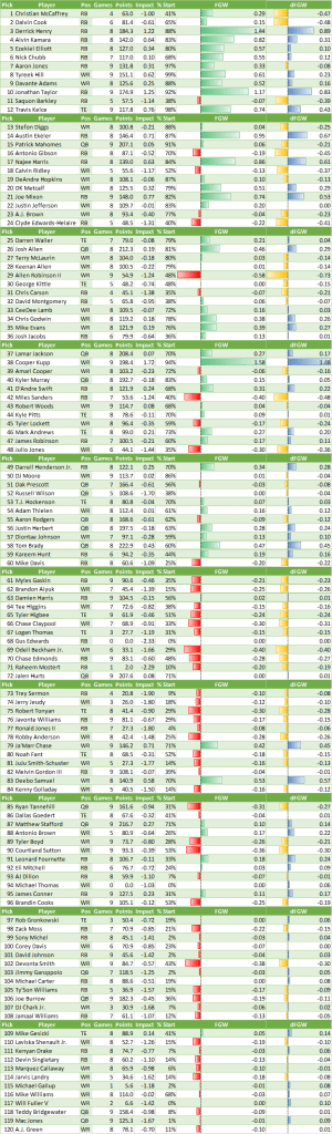 Hypothetically, if Mike Williams were started near 100% of the time (obviously besides his Week 7 bye), his FGW would be around 0.24 – around the 44th best score, worth a 4th round pick.