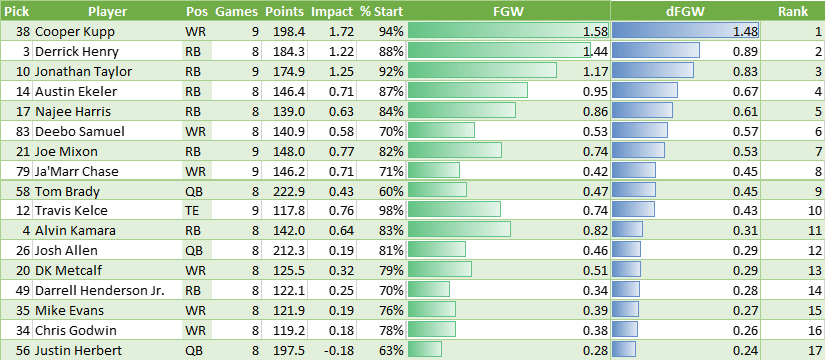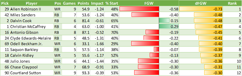 - The later rounds look empty with Mike Williams in there as a thick green bar. Mike Gesicki is now all alone as the only positive FGW player after Round 8.