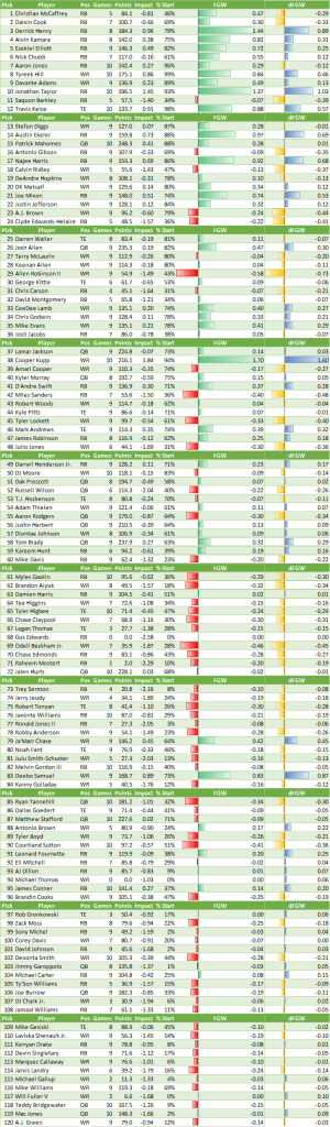 Hollywood Brown by raw performance has been a near top 5 WR (8th most points scored, 6th biggest raw “impact” number), but he’s done almost all of his “performing” on the bench. His Fantasy Games Won number is 0.02, good for WR19 – merely an average starter.