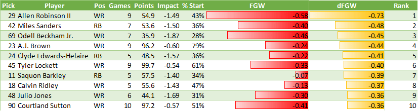 Brown’s huge start to the season was capped off in Week 5, when he put up 29 points while only started in 29% of leagues. Since week 5, his % start has gone up from averaging 25% to 91%. Right on cue, he’s now scoring worse than the average fantasy starter.