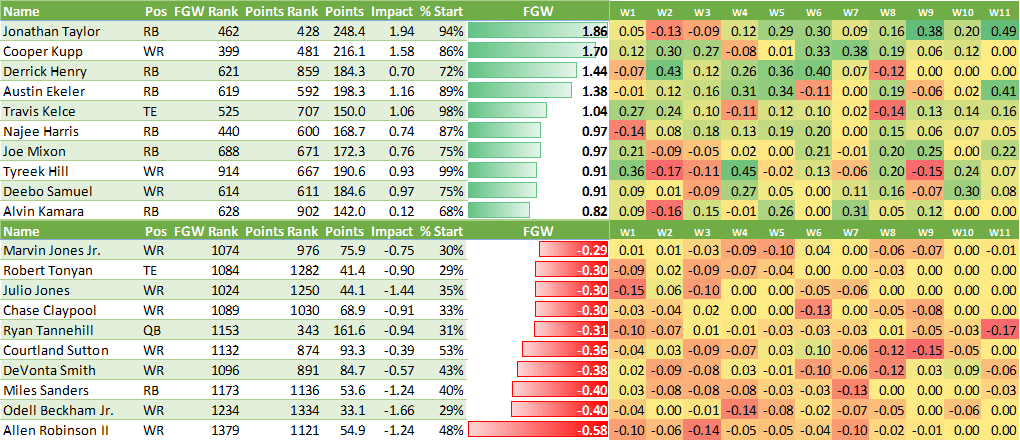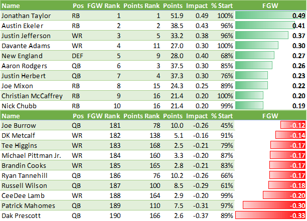 - 2 players (Taylor and Austin Ekeler) above the 0.40 FGW mark – when we only had 4 from weeks 1-10.
