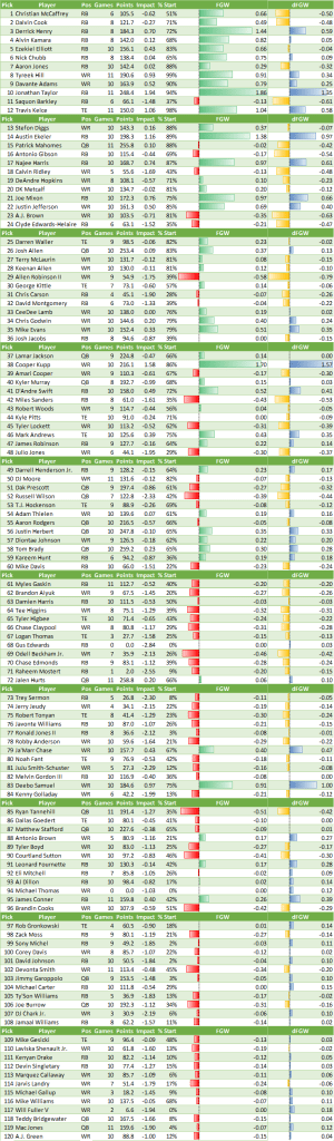 - A lot of shakeup on the Worst Picks list because of how much Taylor is swinging the expected-FGW-by-pick equation.