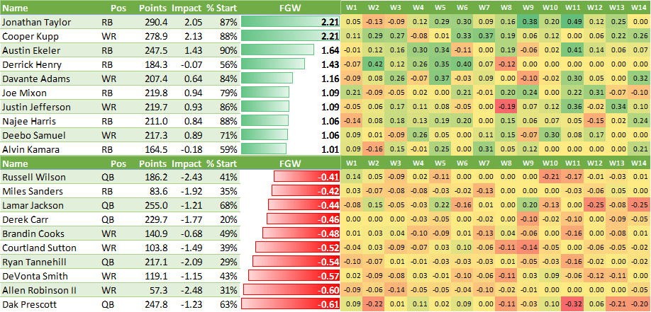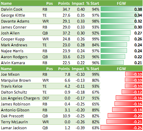 - Derek Carr doesn’t have a single week where he had positive FGW. Being consistently slightly below average is a very efficient way to be bad for your fantasy team.