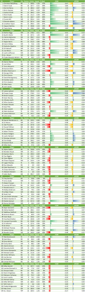 Using the higher-started player for each week, the Cook/Mattison combo hits a season-long FGW of 1.28 so far. That would be a top 5 value so far. Given how middling other players taken around Mattison’s slot are, this is honestly a fair comparison. Using two slots for one player isn’t a great deal, but given how rare the diamonds in the rough seemed to be this year, it’s not that bad.