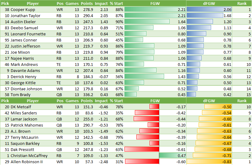 - Cooper Kupp getting bye week revenge on Jonathan Taylor! As we enter the playoffs next week, my general framework is going to be to throttle back impact based on the likeliness you made the playoffs with certain players. It’s not 100% clear to me how to do that yet, though, so I’m going to let it noodle around in my head a bit before committing to a method.