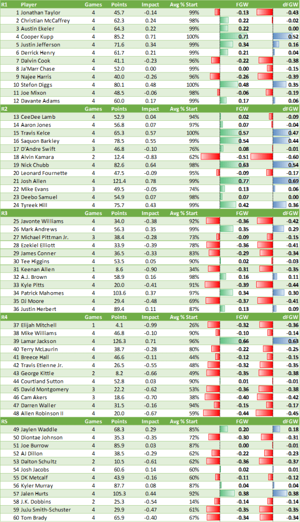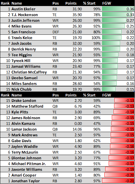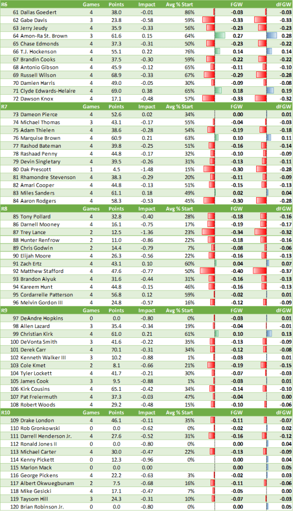 - Alvin Kamara with a brutal 47% started in the London game. Almost as bad of an FGW as Javonte, who had the injury game.