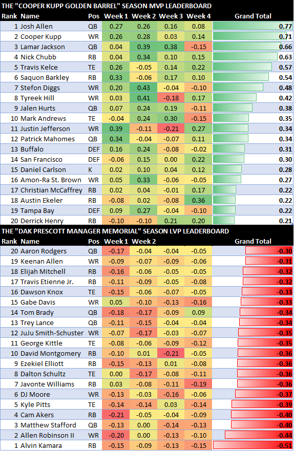 I’m not going to compare the two respective Allen Robinsons yet, as the scoring system changed, but I’ll say this – the 2022 model is seeing % started drop off faster. In 2021, there was almost no benching until Week 4 (drop from 72% to 43%).