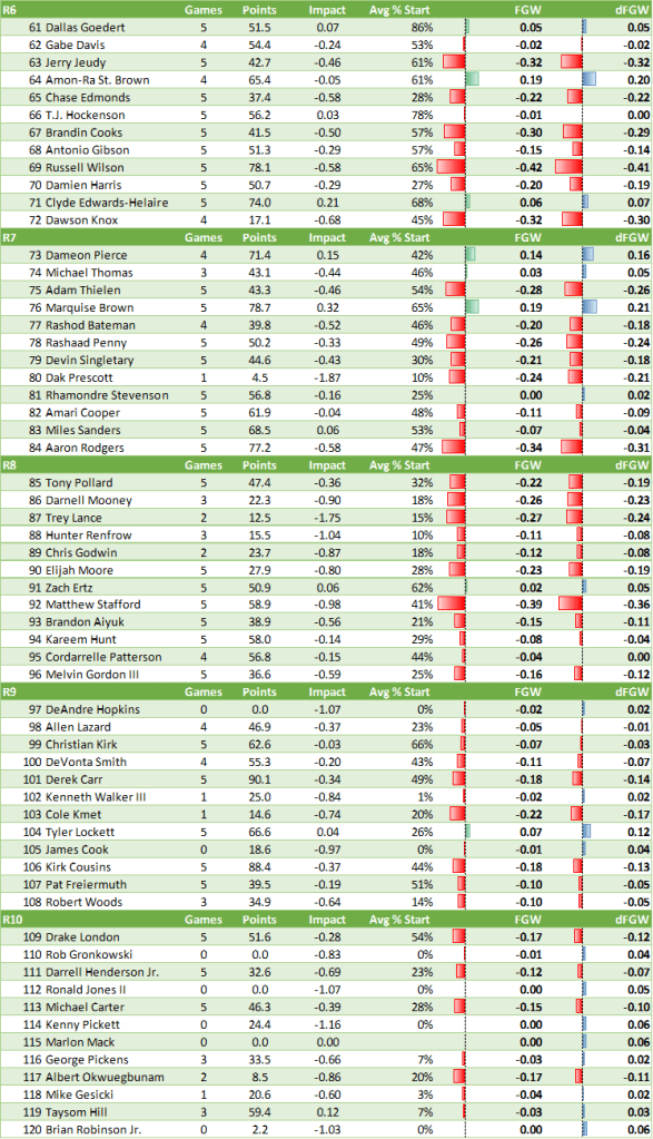 - Slight update this week to the replacement factor – reduced it a bit. Realized that replacement factor/penalty should probably shrink the longer a player is sitting, but haven’t done that analysis yet.