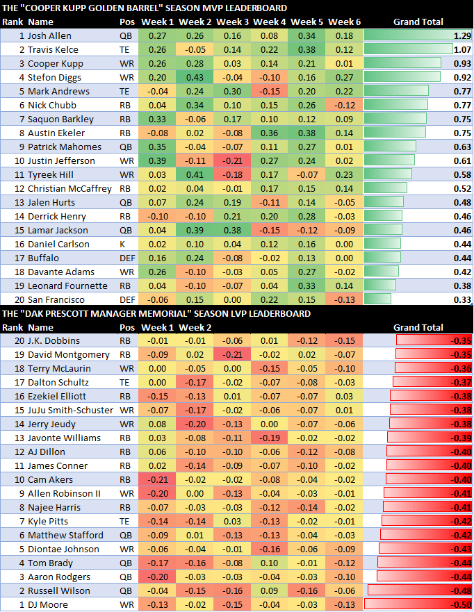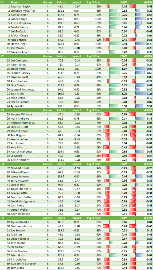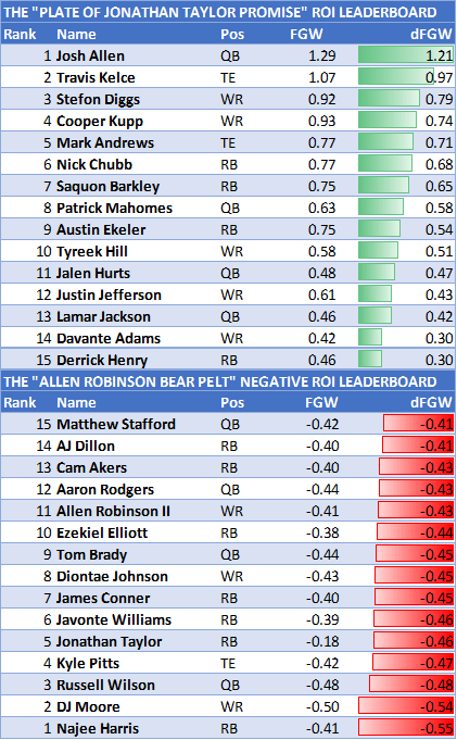 And that’s not even adjusting for ADP! Granted, Cooper Kupp would probably be first in that one as well, but the gap from Allen to Ekeler and Taylor would widen even more.