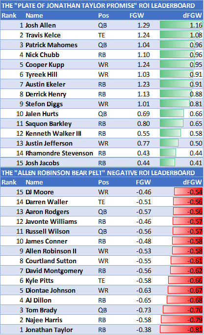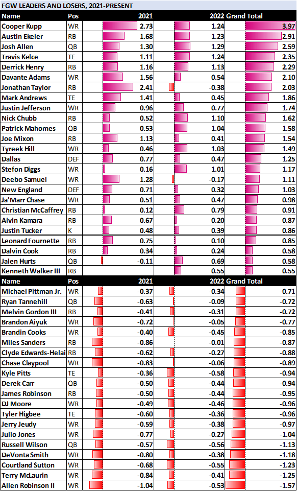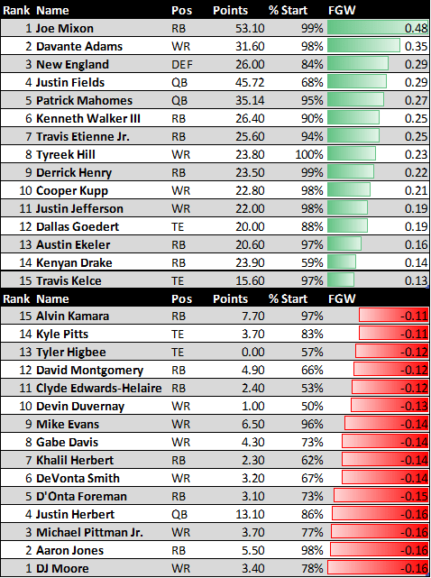 After this week? He’s into the 2nd round – #23 overall in FGW. Because believe it or not, only 15 players have created more wins for their average fantasy team this season than Mixon did in one game (where he just scored 0.48, basically bringing your team from 50% chance of win to 98%, all by himself.)