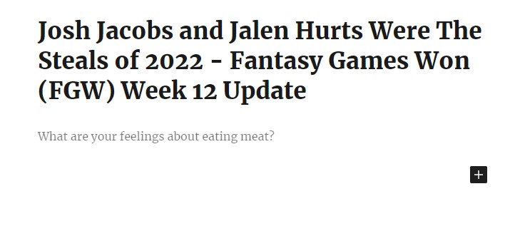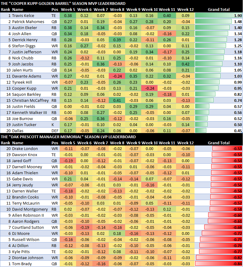 So for all you Josh Jacobs and Jalen Hurts owners out there, good luck in the December stretch run! And for those of you that took AJ Dillon instead, remember that we’re all (eventually) going down in this ship together. It’s been a privilege and an honor.