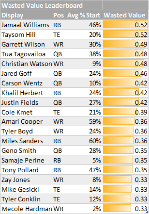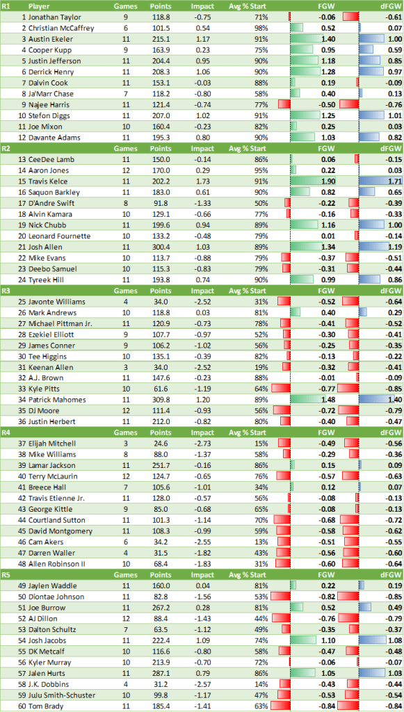 Meanwhile, Josh Jacobs vaulted into the top 10 this past week by turning in a 0.42 FGW – giving his teams an average of 92% chance of winning. It’s only the 7th 0.40+ FGW week of 2022, and the only one by a player drafted outside Round 2 so far.
