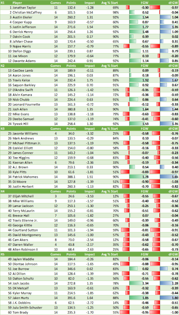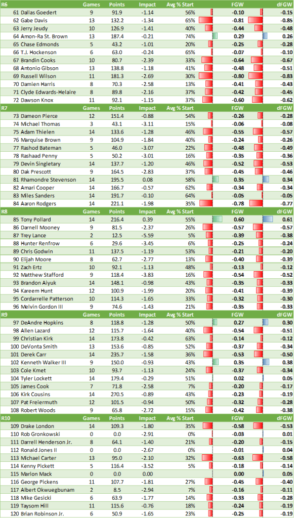 TL:DR; – FGW is the likely number of Head-to-Head fantasy football matchups a player has won his team. dFGW is FGW adjusted for ADP.