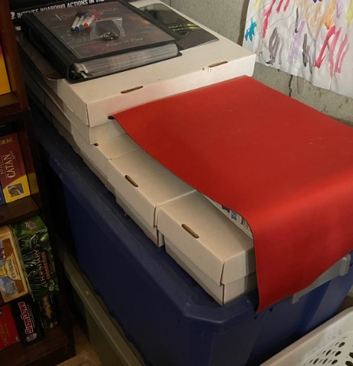 I also use another plastic bin with game bits inside to prop up my work computer monitor. A few years ago, my in-laws figured that my interest in games meant that I’d appreciate their cabinet of mass-market games (many of you have been there). I couldn’t justify the space, but I wasn’t shameless enough to donate them to the local library right away, so I ditched the boxes and packed them all into a bin the size of one large game box.