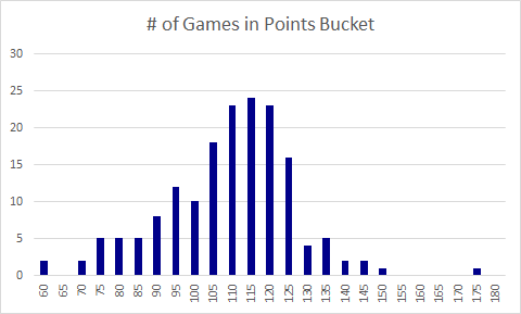 The above chart is a season’s worth of data for one very normal fantasy league. It follows a bell curve closely enough that it’s fair to use a normal curve and standard deviation value to summarize what your fantasy opponents will do.