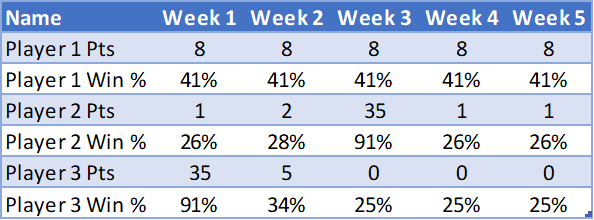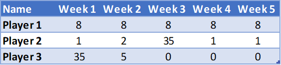 Imagine you have 3 players. They each play the same position – we’ll say WR. They all scored 40 points over a 5 week stretch.