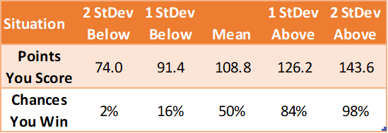 If you assume all else is equal, as in you and your opponent have average players in all positions, one player’s scoring versus the mean at his position can be placed on this chart. Just to be on the nose here, a player scoring 17.4 points more than the average for his position means he has increased your chances of winning a week from 50/50 to 84%. Again, all else being equal.