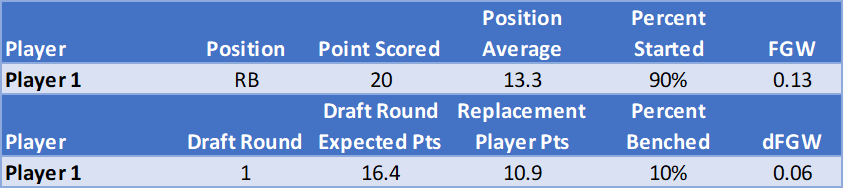 - Whether the player scores when you expect him to matters a lot, too. Player 3 actually helped his team (+0.25 FGW) because his bad weeks were avoidable. He would have had a similar score to Player 2 if you had trotted him out every week.