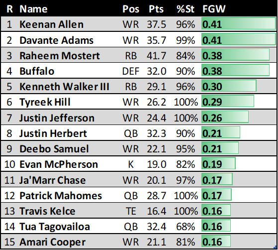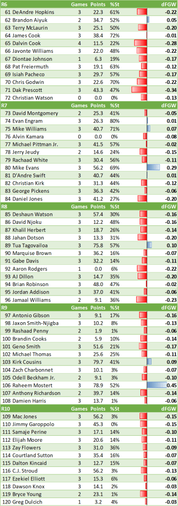 - Raheem Mostert surfed his way to the top spot for Dolphin FGW. Actually pretty impressed he hit an 84% started number. His raw data went up from 42% to 78%, but his weekly expert rankings numbers meant competitive fantasy teams swung harder (33% and 84% by calculation).