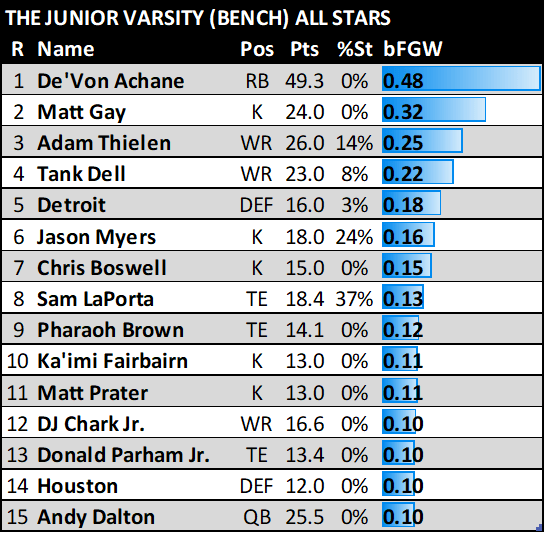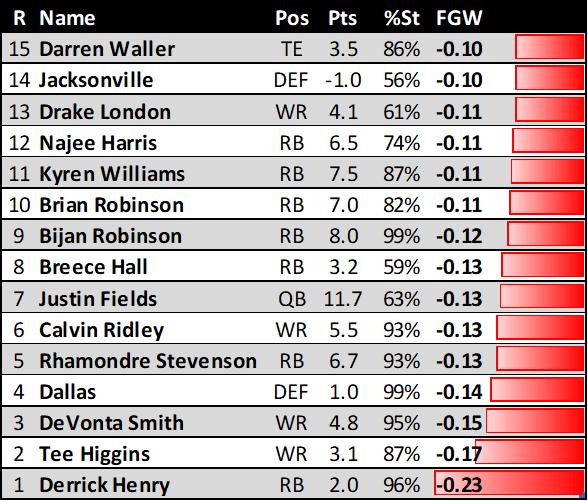 Achane’s percent started on Yahoo! Fantasy Football this past week was 0%. Charitably, it could have been as high as 0.49%, as Yahoo! Rounds to the nearest percent. If you assume this, Achane increased his managers’ win rate up to 98% – but only 0.49% of the time (at most). His FGW comes out to 0.0024. There’s no other player for which rounding at percent started is going to be significant here, so leaving the rest of the board where he is, he comes out to 71st in FGW – thus the 71st most helpful fantasy player – for Week 3. Right between the middling Tyler Higbee and Dameon Pierce, both of whom were average but at least sometimes used.