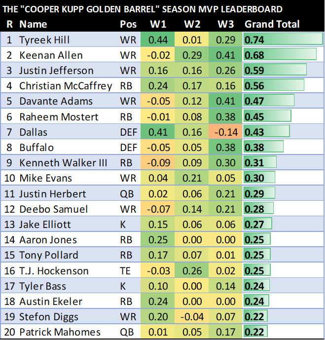 - Through 3 weeks, it looks like the best team you could have realistically drafted is: Tyreek Hill, Davante Adams, Aaron Jones, Keenan Allen, Justin Herbert, James Cook, Mike Evans, Tua, Raheem Mostert, and Dawson Knox (Allen too good to consider Hockenson in round 4).