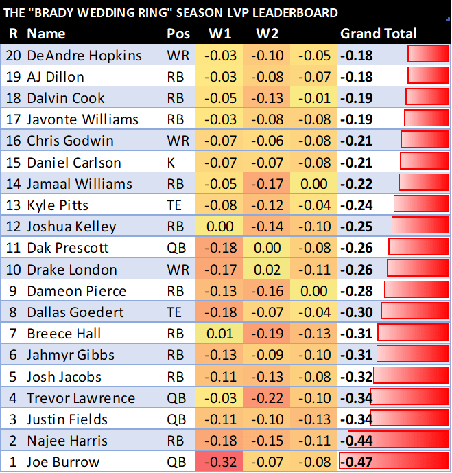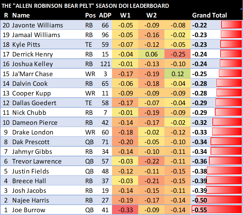 - Shows how bleak of a year it has been when Aaron Jones is still 19th after only playing one game AND adjusting for ADP.
