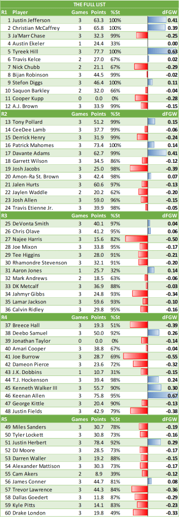 - Crazy levels of consistency from Jefferson and McCaffrey. Only players to be notably above average in all 3 games.