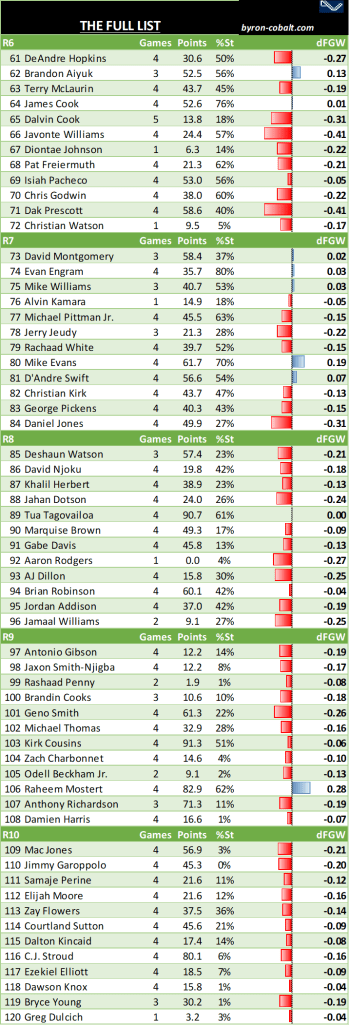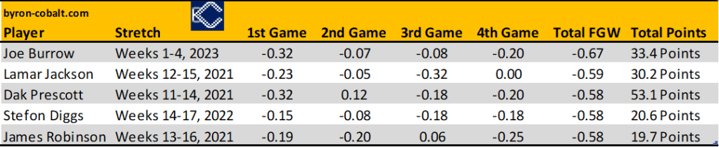 The above chart shows the 5 worst 4-game stretches, based on FGW, that I have on record. Not only did he score very little points – 33.4 points is almost 20 less than Dak had over his bad stretch – but he largely stayed in fantasy lineups every week. Which means he’s definitely dragging your fantasy team’s performance down.