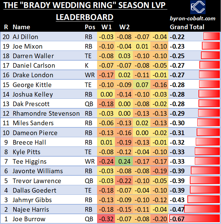 - Starting RBs joining the Backup RBs on the LVP list this week. Well, starters for now. Joe Mixon, Rhamondre, Sanders…Pierce might be OK.