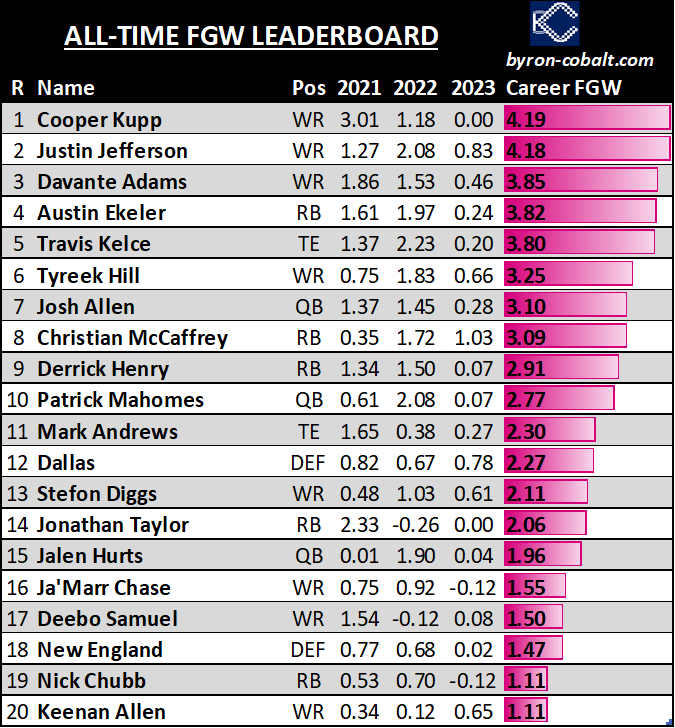 TL;DR – FGW is the number of Head-to-Head fantasy football matchups a player has won his team, on average. dFGW is FGW adjusted for draft ADP rank.