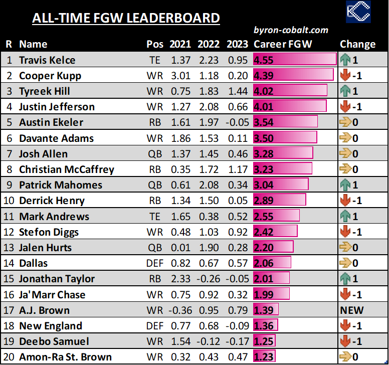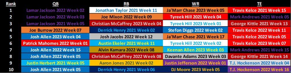 Kelce has 4 of the top 6 TE weeks since the start of 2021. Given how it’s been spread out over that time, I think it’s clear Kelce has owned Tight End more than Lamar or Josh Allen have owned Quarterback. No RB or WR has demonstrated nearly the dominance of their positions, either. We may as well rename the position Travis End.