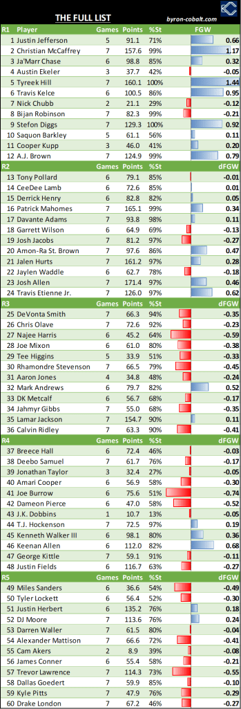 - In the all-up charts I don’t show the undrafted players, but in the race of best value after round 5, Puka making up major ground.
