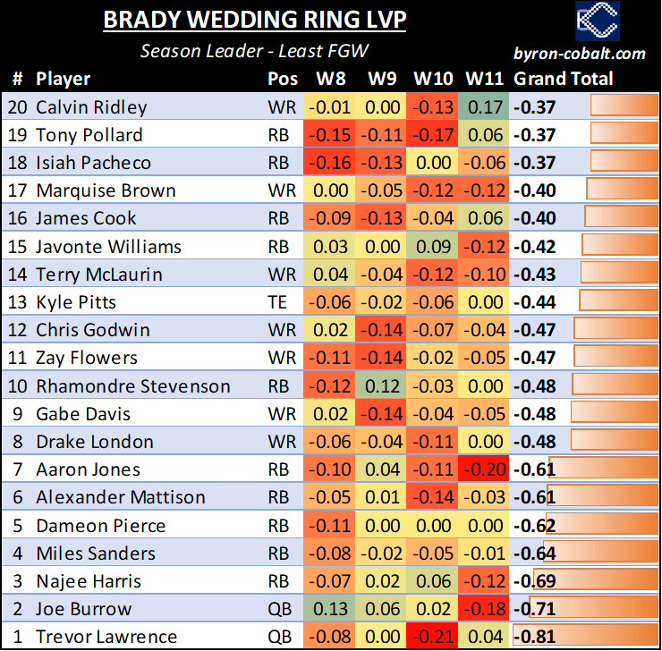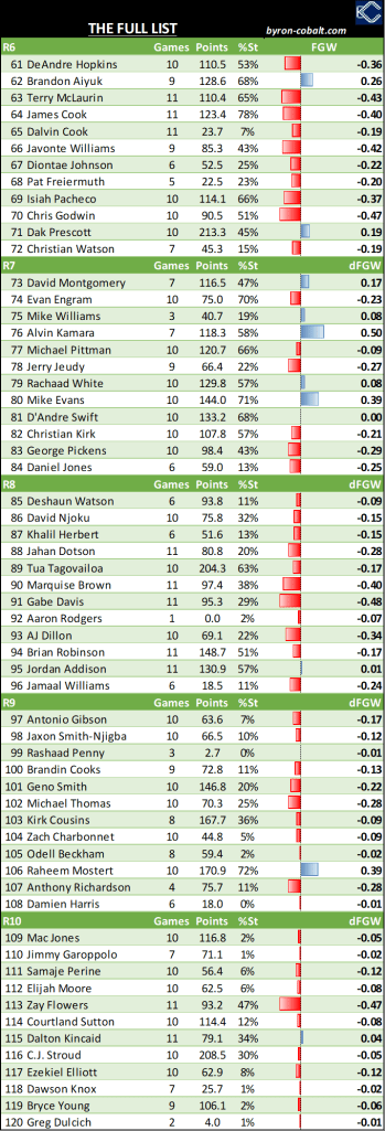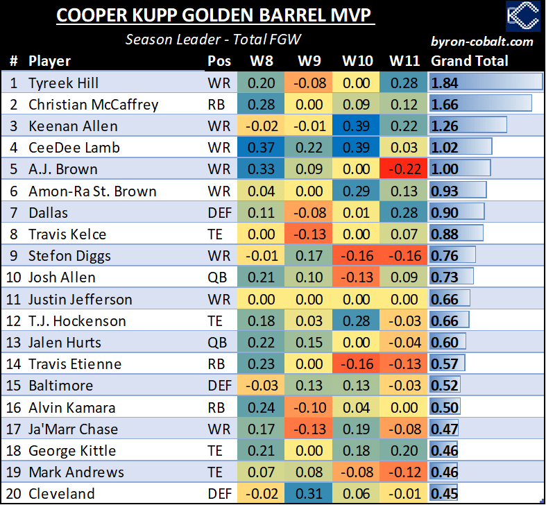 For the recap of Week 11, check out my FantasyPros article or my weekly video. Here we’re going to dive into how the MVP race is shaking up, taken both from the angle of FGW and dFGW.