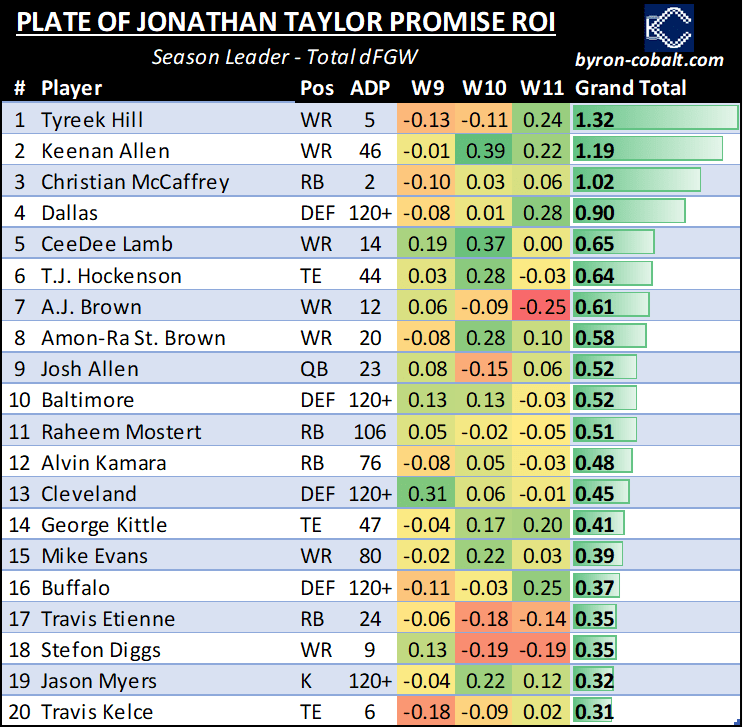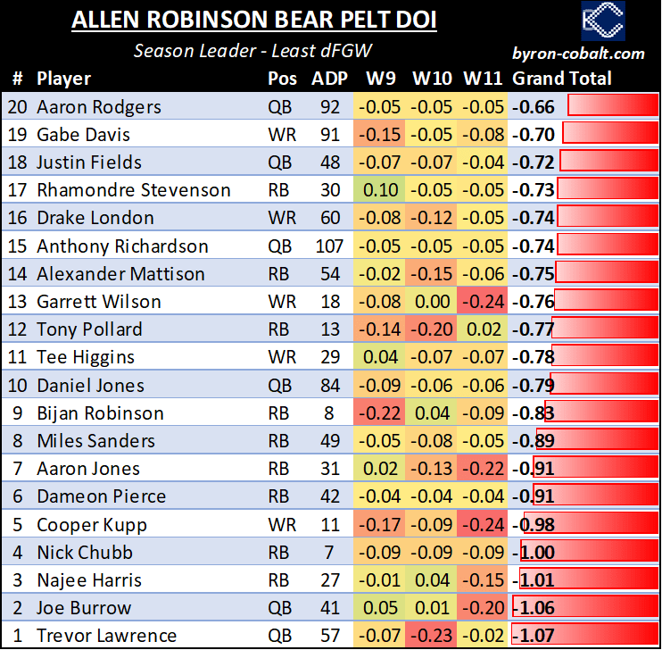 - Not on the list: De’Von Achane. He’s down to 0.06 FGW for the season after getting hurt in Week 11 and cratering lineups. That’s what we get for going to 8chan for Fantasy tips.
