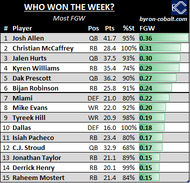 - A lot of typical fantasy studs on the Week 12 winners this week – Josh Allen, McCaffrey, Hurts, Dak, Tyreek, even Jonathan Taylor and Derrick Henry.