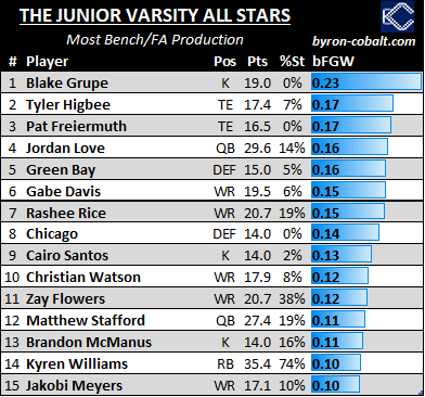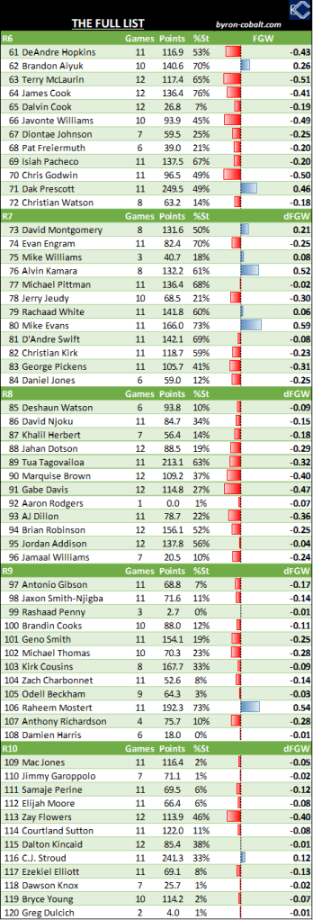 - Housekeeping note: I had a mini-epiphany on how I should be calculating dFGW. The rate at which players actually play should be part of the baseline expectation for the draft slot. More to come next week.