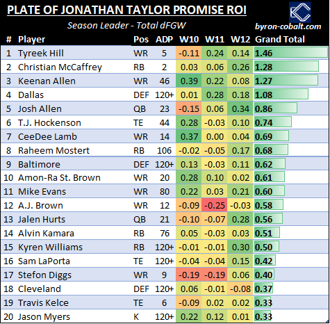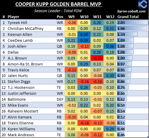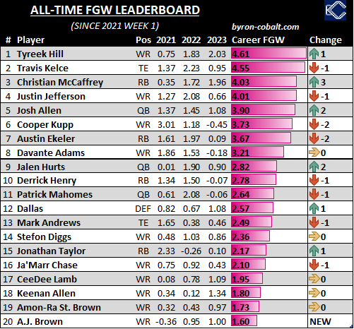 - Meanwhile, Tyreek passed Travis Kelce for the top FGW slot since the beginning of 2021! This is notably partly because Kelce has still been the top Tight End in 2023. Just more evidence for how absurd Hill has been.