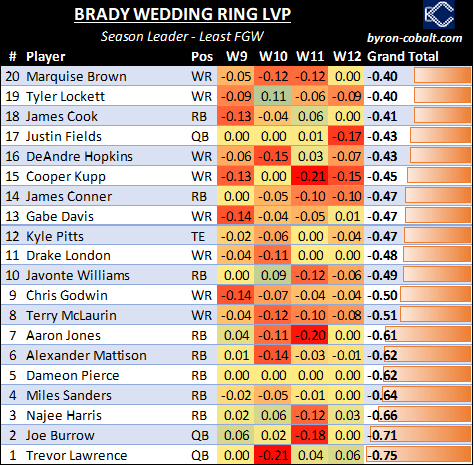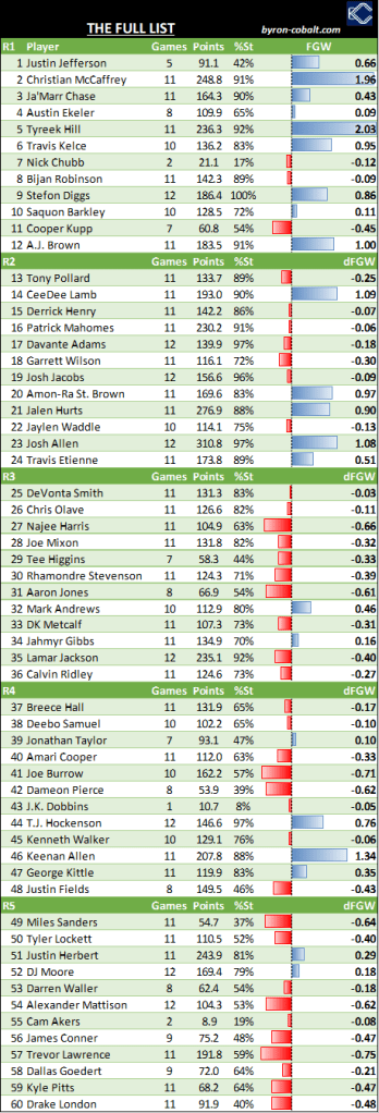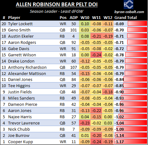 Keenan Allen, our lone C-graded player, has been very good, but not league-winningly great. CeeDee Lamb got all his value from a 3-game stretch from weeks 8-10. Josh Allen had almost a third of his value in Week 12 alone. Dallas Defense, as strangely good as they’ve been, have been out of the discussion since Week 3’s dud against Arizona.