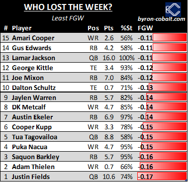 - No single player blew the doors off their fantasy team this week, as the worst skill player (Thielen) was only started 66% and the worst QB (Fields) scored 10.6 points.
