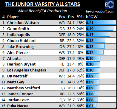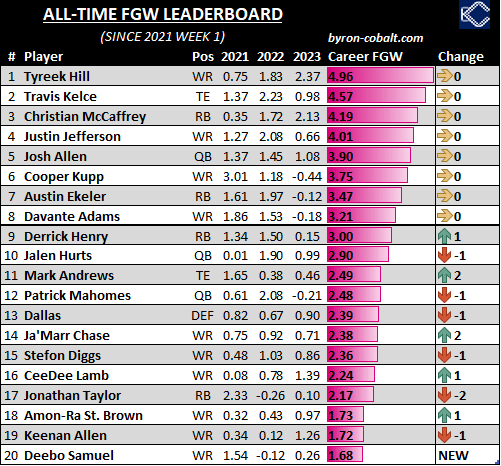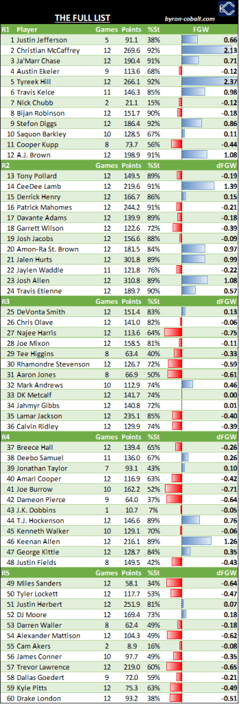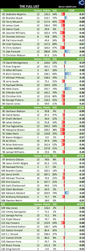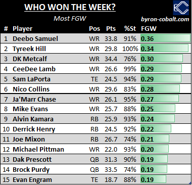 - High threshold for the top list this week – 0.19 is a very good score. Some weeks #15 has been as low scoring as 0.08 FGW.