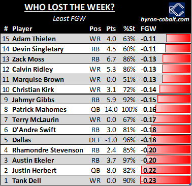 - I feel bad highlighting Tank Dell’s week so much because he was injured and that’s 100% not his fault. Honestly, the fact that injured players are so harmful/irreplaceable is one of the faults of Fantasy Football, IMO.