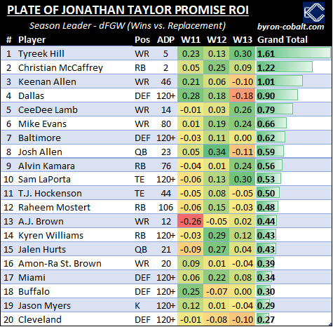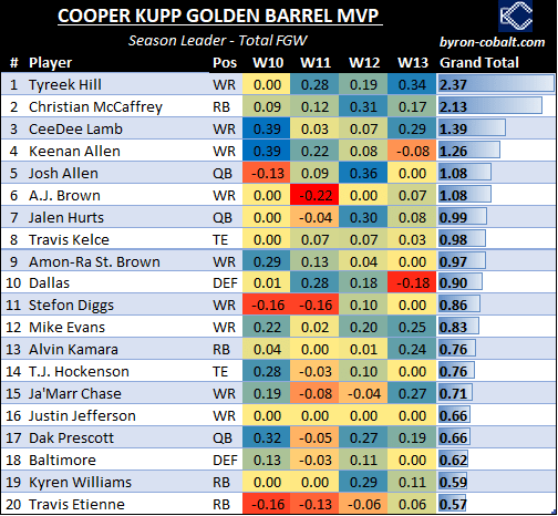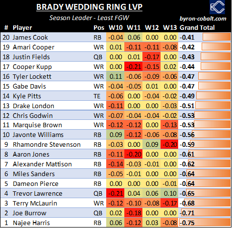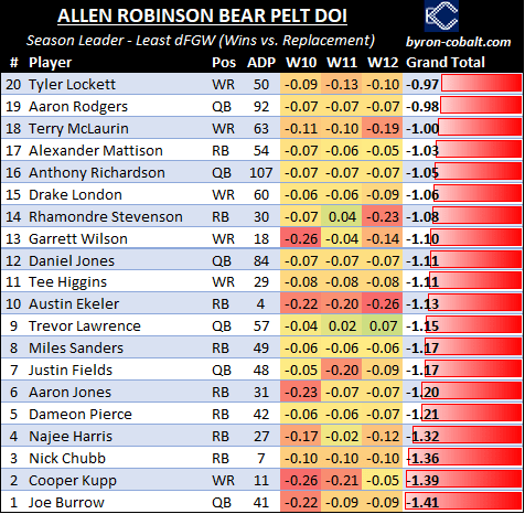 - With the updated dFGW equation, looks like Burrow will edge out Chubb for the lower score. Najee might be within striking distance, but I think it’ll come down to Burrow and Cooper Kupp for DOI (Disappearance of Investment) for the year.