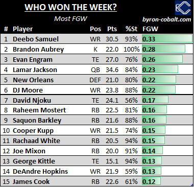 This was a strange week for the top players. Look at those percent started numbers – outside of Aubrey, nobody was above 94%.