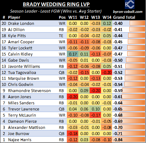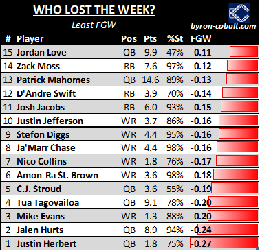 - Looking at the bottom 10, there are only a few players you can consider starting for Week 15 (and thus could continue to hurt your) – Najee, McLaurin, T-Law, and Godwin. I think Najee’s got LVP in the bag.